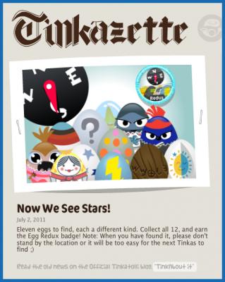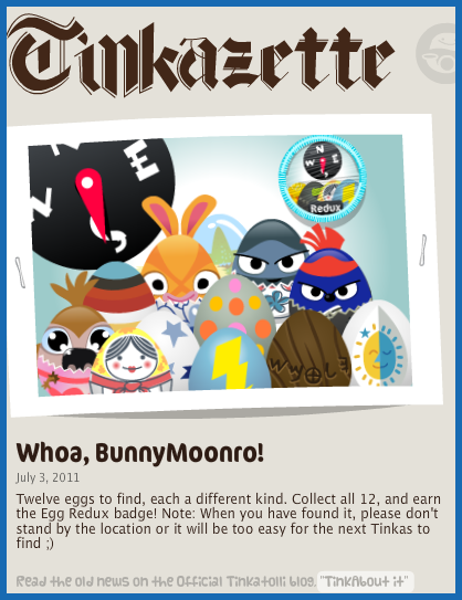 . Tinkatolli has released its 10th edition of their daily newspaper, the Tinkazette. The twelfth and final egg of the Egg Hunt Redux has been hidden somewhere in the Island. Today it’s the new yet rare bunnymoonro egg and with this egg, the Hunt ends and most of us Tinkas will have gained the rare Egg Hunt Redux badge, but it hasn’t been released yet. The badge will be awarded Monday or Tuesday. You can read more in the forum under “News from HQ”. Trader Tinka is still offline.
