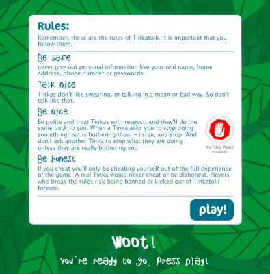 Tinkatolli has just added the rules to their virtual world, they will pop up as soon as you login. This is great, especially for the new players who don’t know what is and what isn’t allowed to be done or said on the game. Below is a picture of the rules.