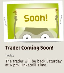 You will then see the Tinkatolli Time. Will you be trading with Trader Tinka? Hey Tinkas, Tinkatolli has announced that Trader Tinka is back. Trader Tinka’s Status (ONLINE) –