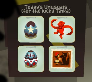 Really liking how we can relax at Upper Canopia and watch the world go by. Do you like these new benches? Hey Tinkas, Tinkatolli has released a new Unusual Clearing badge. To get this badge, you need to buy ONE of every Unusual in the Unusuals Outlet.